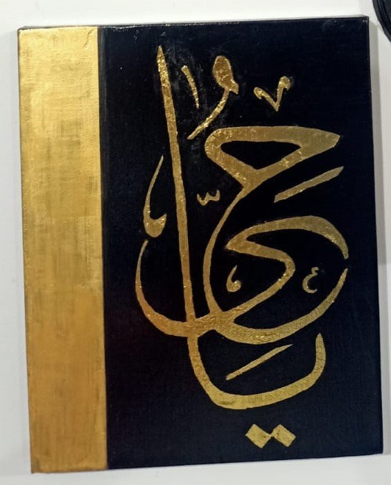 Calligraphy of Allah’s characteristic name. Handmade on a 20cm x 25 cm canvas.  Premium gold acrylic colour is used on a rich black acrylic background.