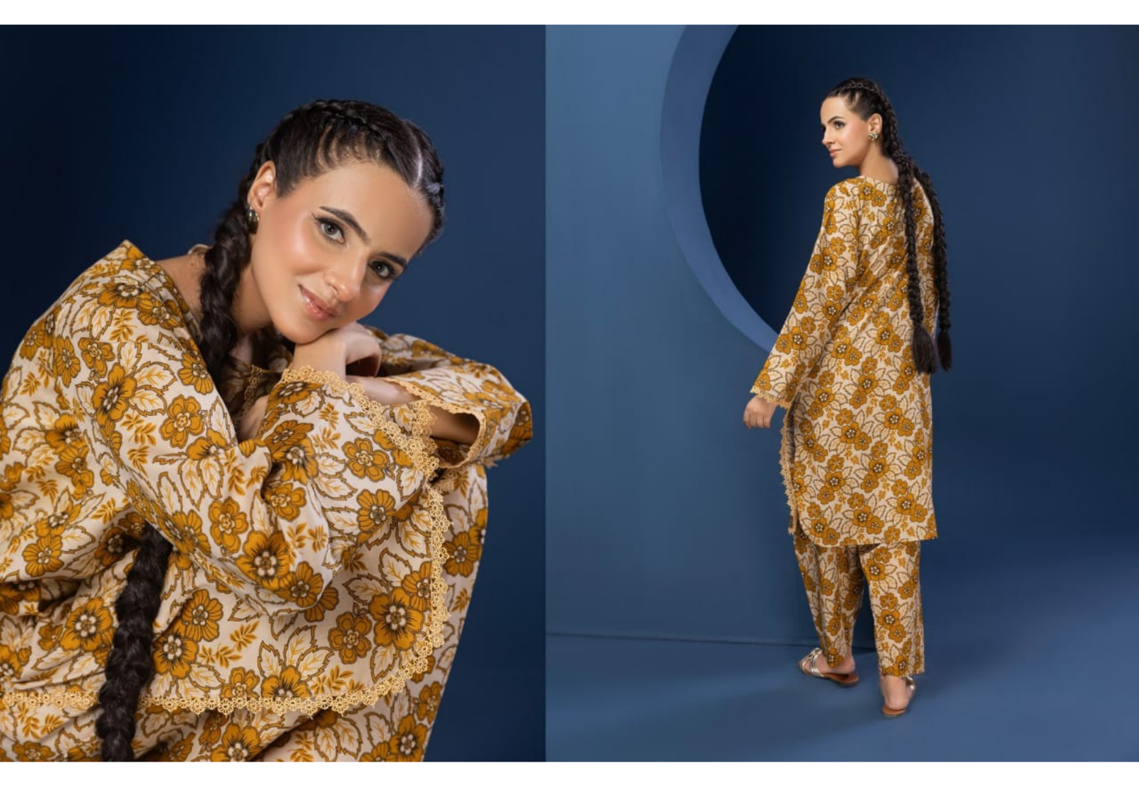 A beautifully designed floral dress (100 % cotton) includes a shirt and trousers.